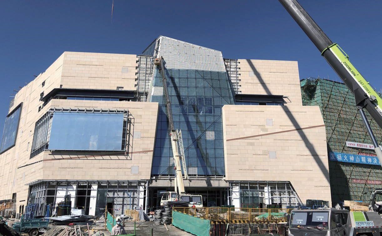 在整個(gè)幕墻系統(tǒng)安裝施工中,面積最大的部分是石材幕墻系統(tǒng),它是突出整體建筑效果的基礎(chǔ),為完美呈現(xiàn)項(xiàng)目的地域特點(diǎn)和建筑氣勢(shì),凸顯民族工藝細(xì)節(jié),前期的選礦環(huán)節(jié)尤為重要,港源幕墻項(xiàng)目部組織業(yè)主親臨礦山開(kāi)展實(shí)地考察,根據(jù)不同石材特性和施工需求進(jìn)行分析論證,最終決定采用產(chǎn)自烏魯木齊本地的卡拉麥?zhǔn)淖鳛槟粔τ昧?。施工全階段十分注重石材防護(hù),材料出廠前由項(xiàng)目組對(duì)石材進(jìn)行六面防護(hù)措施檢查,其中,防護(hù)劑的使用降低了酸雨對(duì)石材的浸入。石材掛裝完畢后再由專(zhuān)業(yè)人員對(duì)石材表面進(jìn)行清洗維護(hù),嚴(yán)謹(jǐn)?shù)姆罎B防污措施能有效避免成品損壞或墻體污染,保證了幕墻施工質(zhì)量和最佳展示效果。