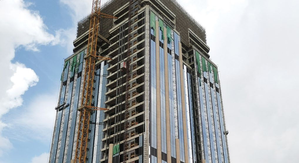 廣州天河區(qū)金融城起步區(qū)地塊基本處于開挖基坑狀態(tài),使得眼前動(dòng)工的項(xiàng)目恰似一座火熱的“孤島”。在主體結(jié)構(gòu)進(jìn)度嚴(yán)重滯后的情況下,幕墻有效施工時(shí)間為40天,造成了項(xiàng)目工期緊、作業(yè)場(chǎng)地環(huán)境 復(fù)雜。面臨首、二層大堂超大玻璃施工、較大石材單元柱施工、較高鋁板開啟扇施工和吊籃搭設(shè)等施工難題,但港源幕墻項(xiàng)目團(tuán)隊(duì)一往無前,將難關(guān)逐個(gè)攻破。