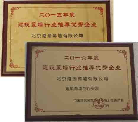 2016年4月,經(jīng)中國建筑裝飾協(xié)會幕墻工程委員會的專家聯(lián)合評審,港源幕墻榮獲“建筑幕墻制作安裝推薦優(yōu)秀企業(yè)”,這是港源幕墻連續(xù)兩年獲得該項殊榮,充分體現(xiàn)行業(yè)專家對港源幕墻專業(yè)技術(shù)的認(rèn)可。